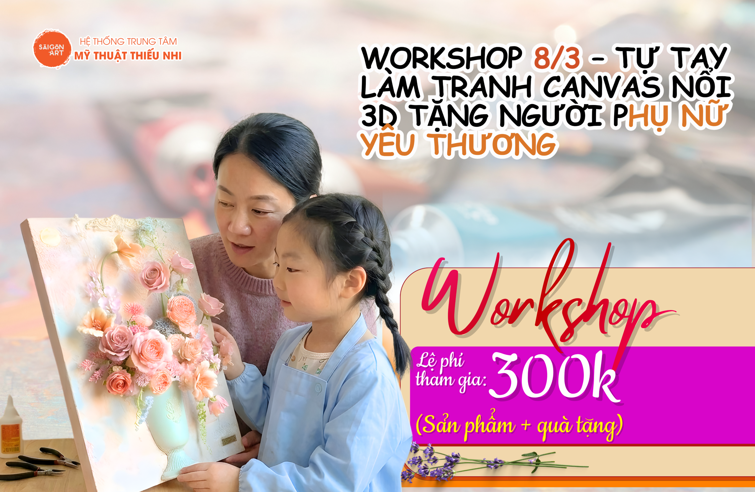Nhân dịp Ngày Quốc tế Phụ nữ 8/3, cơ sở SaiGon Art Phổ Quang đã tổ chức workshop làm tranh canvas hoa nổi 3D dành cho các bạn nhỏ. Đây là hoạt động sáng tạo giúp các “họa sĩ nhí” …