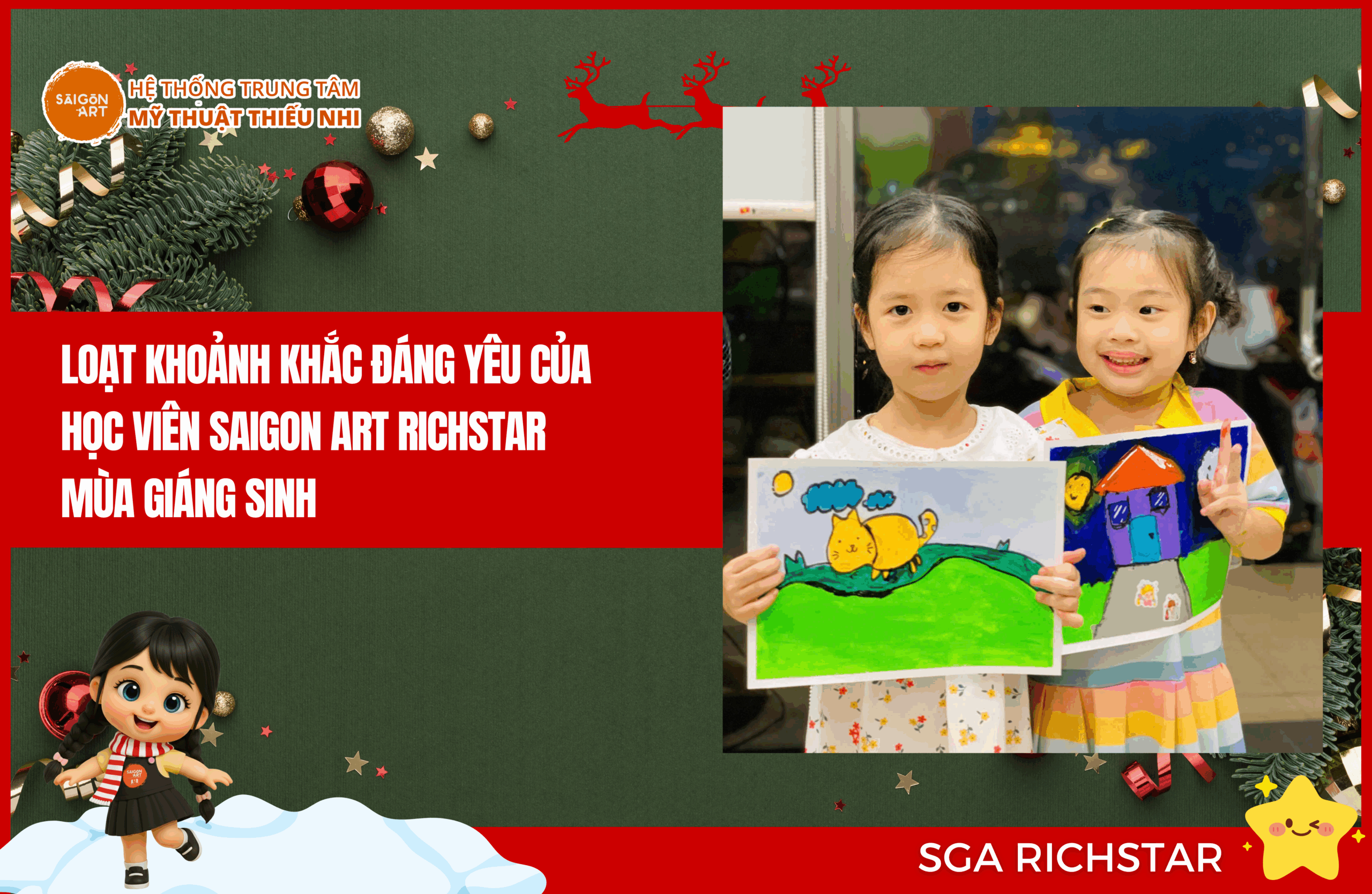 Không khí Giáng Sinh đã tràn ngập mọi ngóc ngách, mang theo sắc đỏ rực rỡ và những giai điệu rộn ràng. Tại Saigon Art Richstar, mùa lễ hội năm nay lại càng trở nên đặc biệt hơn khi đón chào những hoạt động nghệ thuật và vui chơi đầy thú vị cùng các học viên nhí.